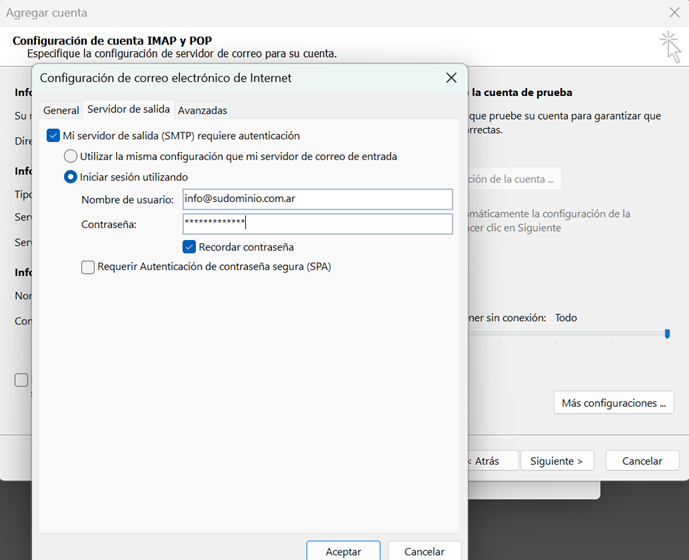 Ir a la solapa “Servidor de Salida” tldar la opcion “Iniciar seción utilizando… y complete nombre de usuario y contraseña. Aceptar